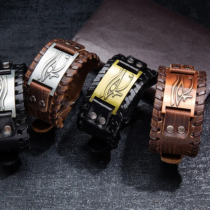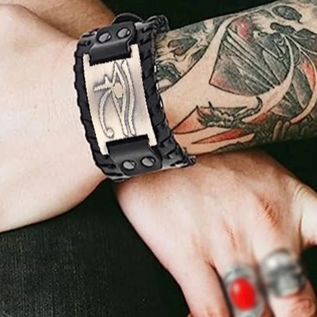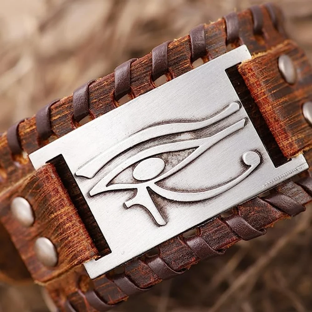 Embrace ancient symbolism and rugged style with this Viking-inspired genuine leather wrap bracelet. Featuring the Eye of Horus and Isis talisman, this bracelet blends Egyptian mysticism with punk fashion, creating a bold statement piece for men.
